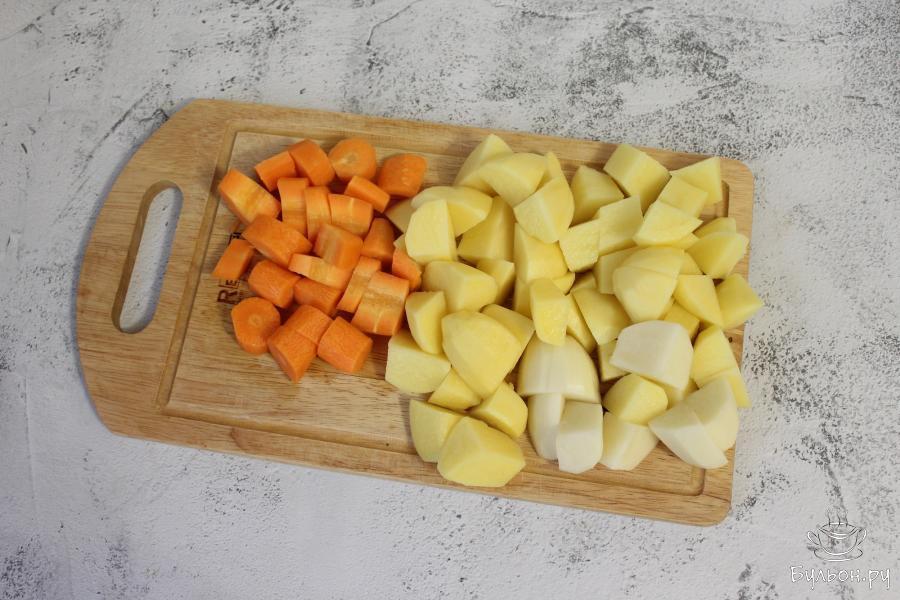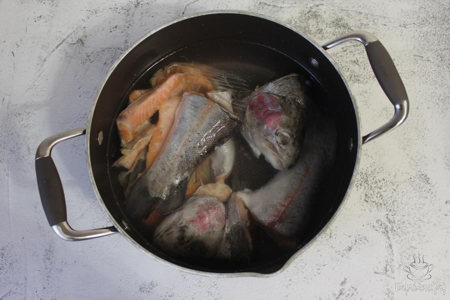2. Извлеките из кастрюли рыбу и в процеженный бульон выложите крупнонарезанные картофель и морковь, варите их до готовности, примерно 20-25 минут.