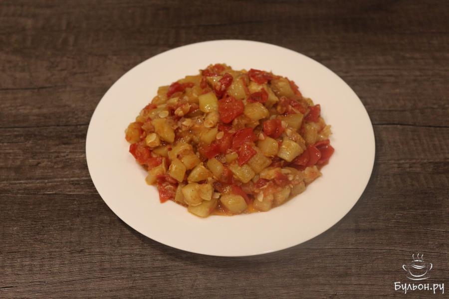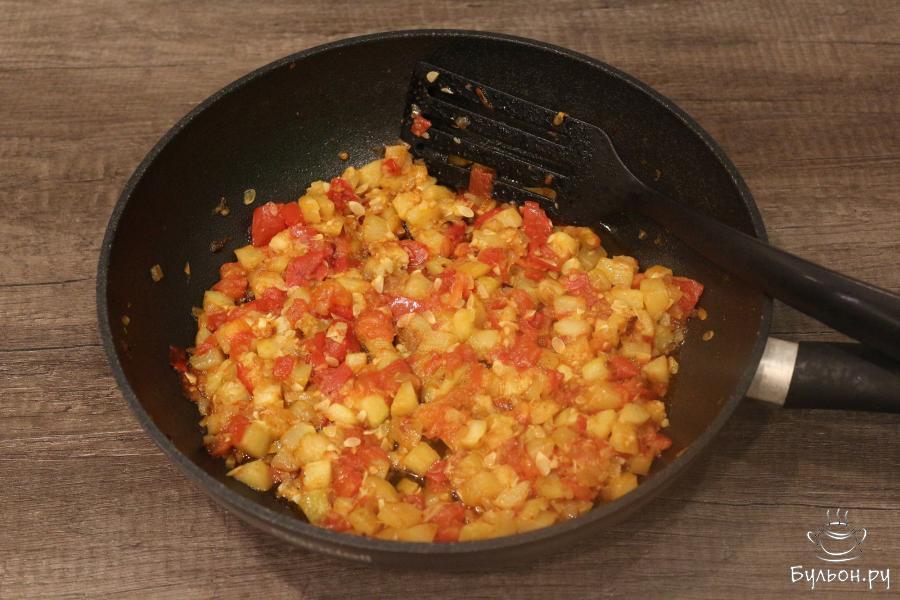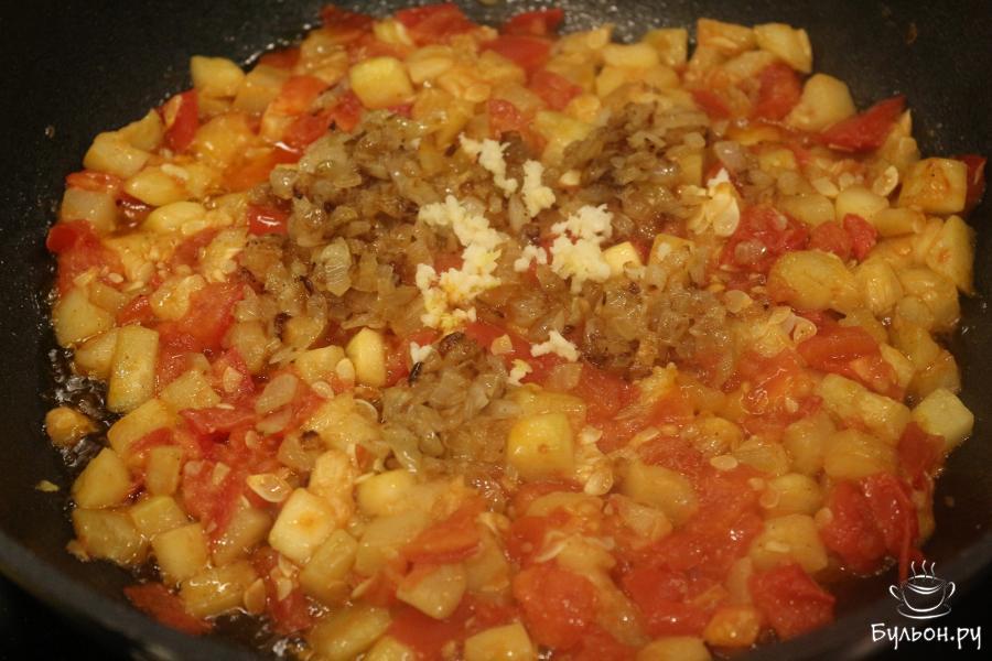 5. Когда кабачки с помидорами будут готовы, добавьте обжаренный лук и измельченный чеснок, соль и перемешайте.