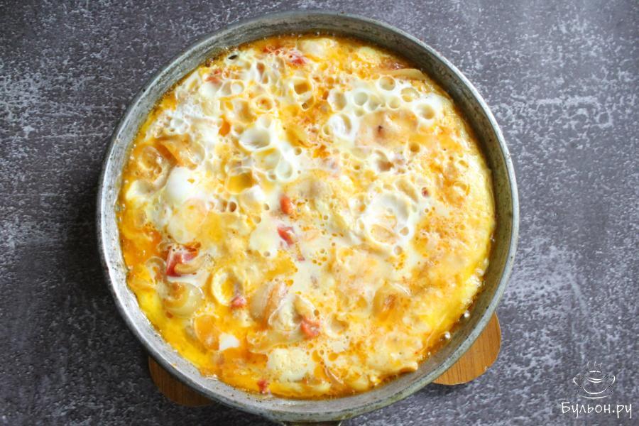Греческий омлет с овощами и сыром, прекрасный вариант для нового сытного завтрака из яиц. Омлет получается сочный, насыщенный, яркий, вкусный, с тянущимся, расплавленным сыром. Если вы больше любите брынзу, то можно использовать ее для приготовления такого омлета. Готовится омлет быстро, просто, из доступных продуктов. Сыр для приготовления берите любой, твердый. Болгарские перцы подойдут любого цвета.