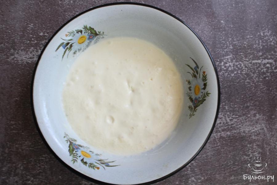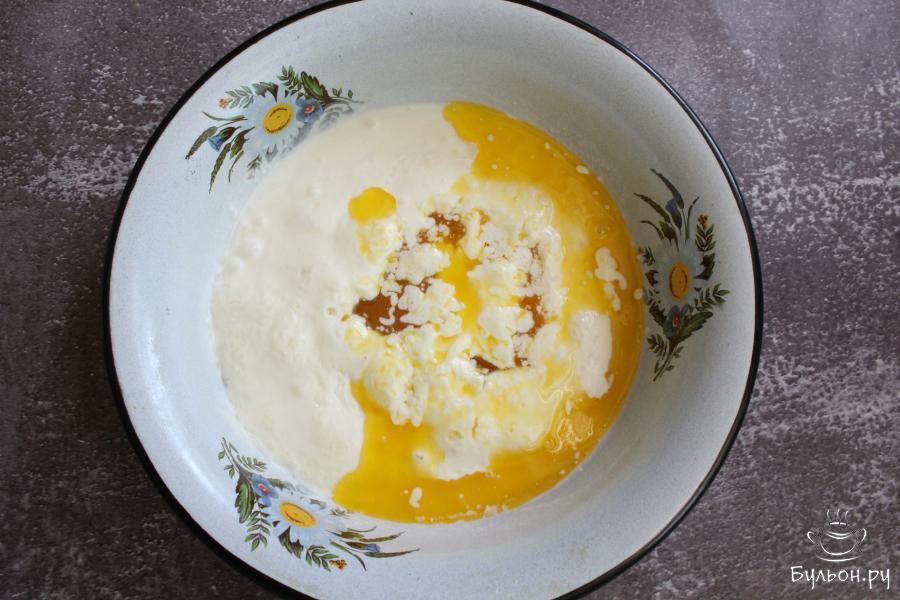 3. Масло растопить, остудить и добавить в чашку. Перемешать и добавить стакан муки. Перемешать, остальную муку добавлять понемногу, чтобы получилось мягкое тесто.
