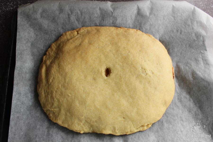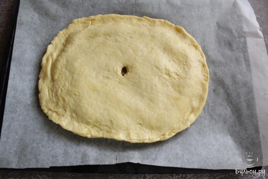 5. Тесто разделить на два одинаковых кусочка. Раскатать кусочек теста в пласт толщиной полсантиметра. Выложить тесто на противень и разложить на тесто начинку.