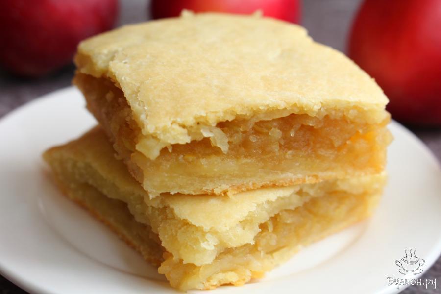 Закрытый яблочный пирог из пресного теста очень простой и очень вкусный. Выпечка готовится на пресном тесте, без использования яиц, поэтому такой пирог можно предложить к вегетарианскому столу. Пирог порадует вас своим вкусом, он нежный, мягкий, аппетитный, с сочной начинкой. Если для начинки взять очень сладкие яблоки, то может быть так, что совсем не понадобится добавлять сахар. Готовится яблочный пирог очень просто и быстро, вкусный он как горячий, так и холодный.