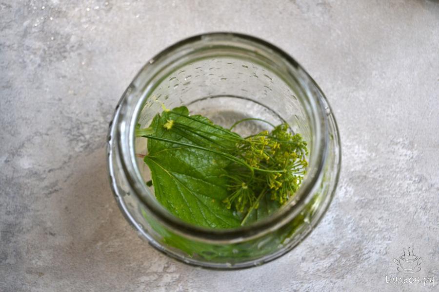 2. Банки и крышки промойте горячей водой с содой, простерилизуйте удобным способом, крышки прокипятите несколько минут. В банки положите зонтик укропа, лист черной смородины, черный перец горошком.