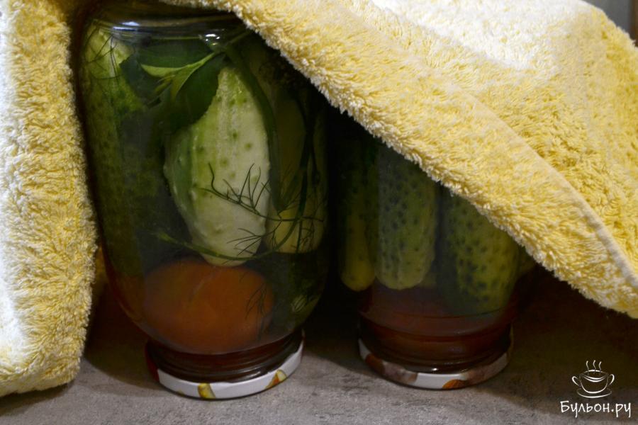 4. Залейте в банки до самого верха кипящую воду. Банки прикройте крышками и оставьте прогреваться на 20-25 минут.