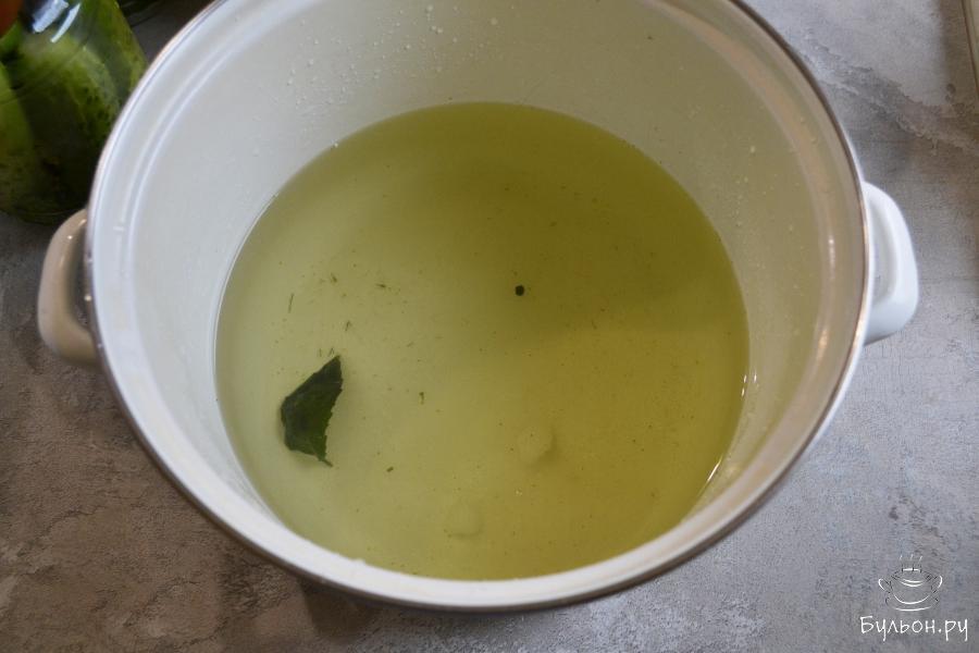 6. Через 20-25 минут воду из банок слейте в кастрюлю. Кастрюлю поставьте на огонь, доведите до кипения, чтобы сахар и соль полностью растворились. Снимите кастрюлю с огня, влейте уксусную эссенцию.