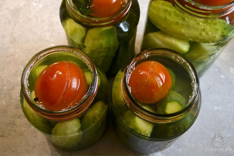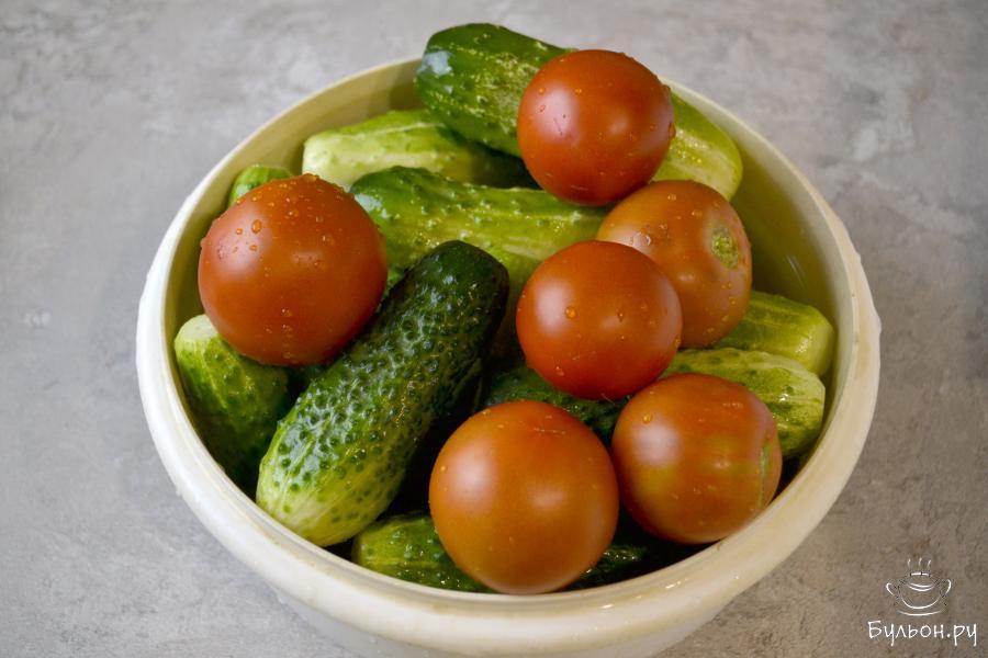 Сезон домашних заготовок продолжается. Приготовим сегодня ассорти из огурцов и помидоров на зиму. Для заготовки лучше взять небольшие огурчики и плотные помидоры. Количество овощей указано приблизительное и будет зависеть от их размера. Вы всегда можете положить больше помидоров или огурцов. Вкус маринованных овощей будет напрямую зависеть от маринада, поэтому нужно сделать его максимально вкусным. Рецепт дан на 3 л. банку. Чтобы маринад получился вкусным, на 3 л. банку положите 5 ст. л сахара и 2 ст. л. соли. Такой маринад можно просто выпить или использовать для выпечки печенья или хлеба.