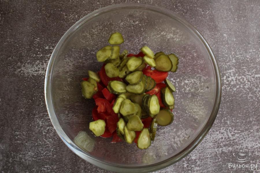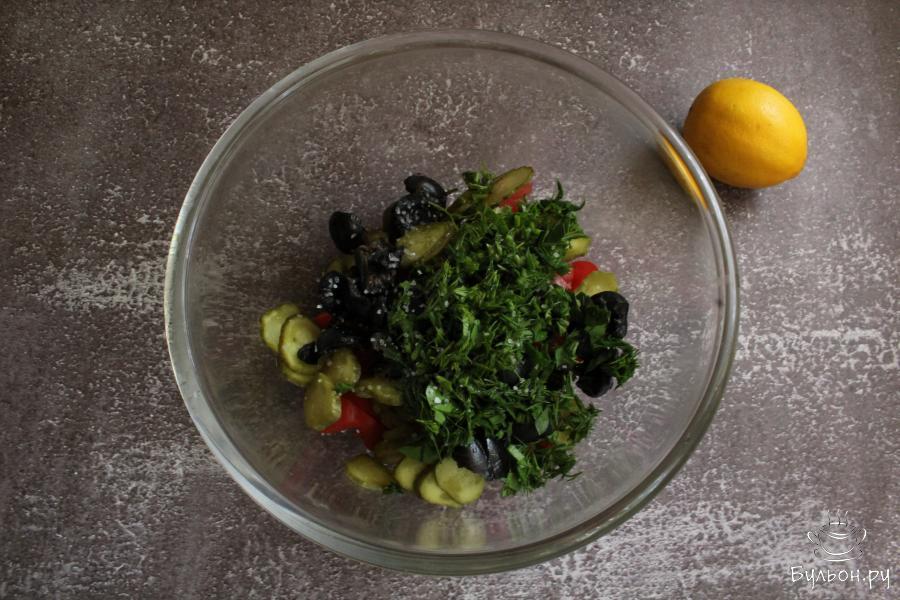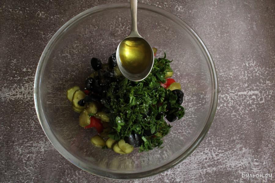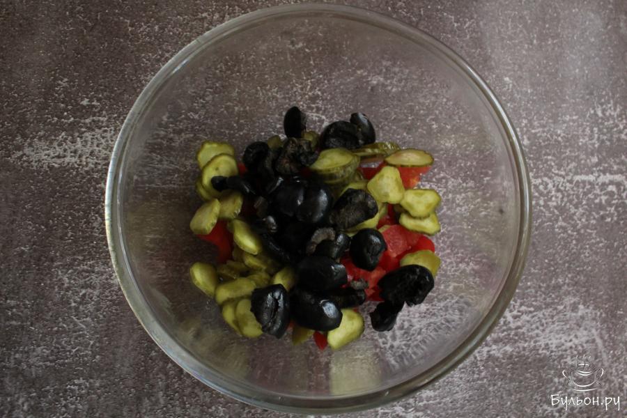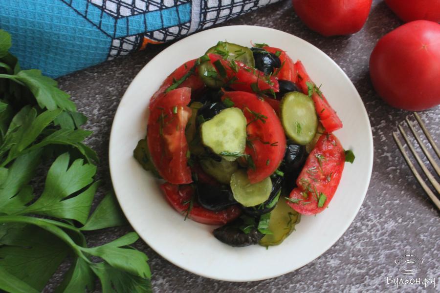 Легкий салат с маслинами, помидорами и маринованными огурцами отлично подходит, как для повседневного, так для постного и вегетарианского меню. Салат порадует вас своей сочностью, он вкусный, полезный, яркий и насыщенный. Такой салат можно подать сразу, в жару его можно охладить и он станет еще вкуснее. Готовится такой вкусный и бодрящий салат за считанные минуты. Зелень для приготовления берите ту, которую любите.
