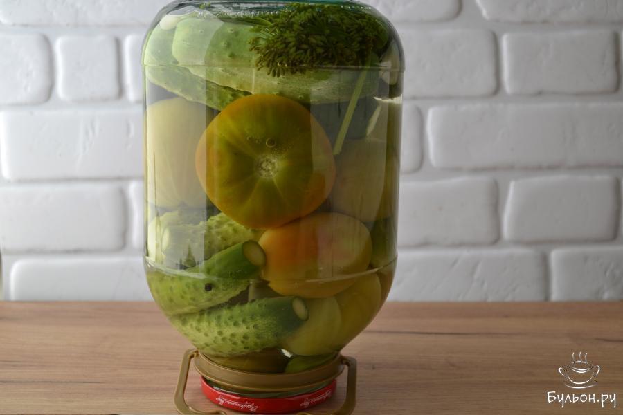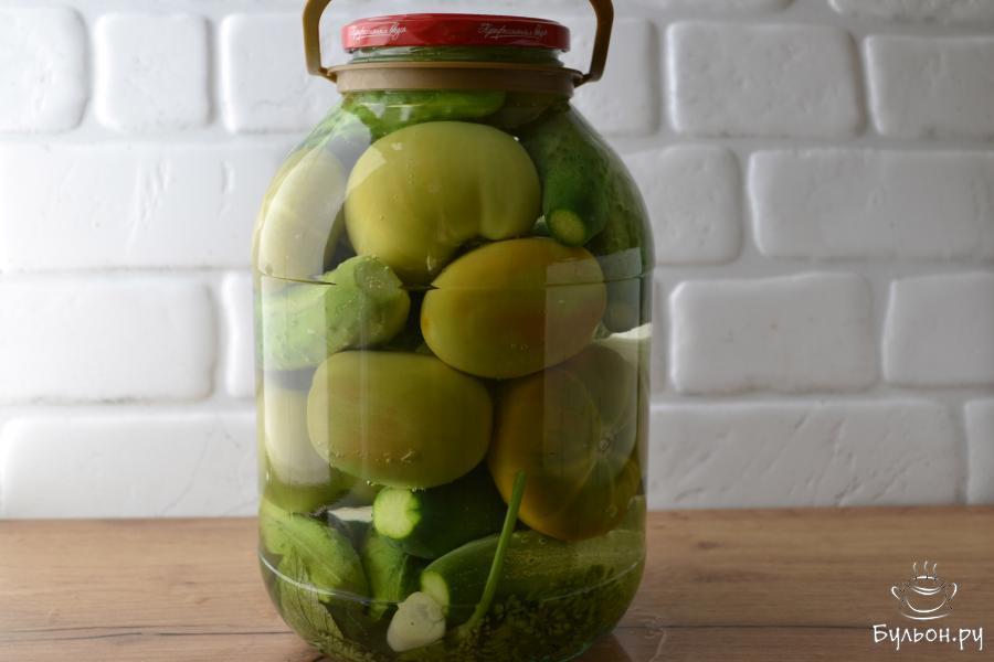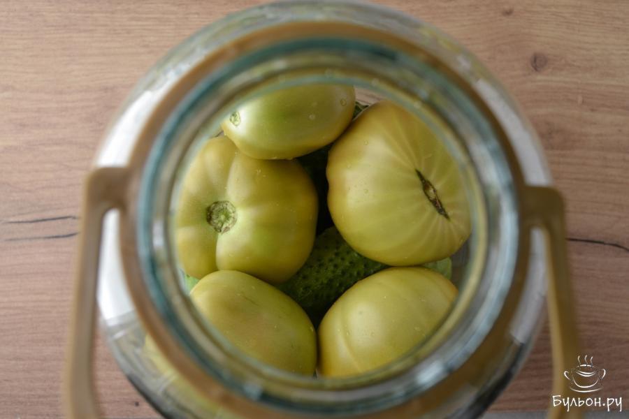 Маринованные огурцы с помидорами - это, пожалуй, самая популярная домашняя заготовка на зиму среди хозяек. Обычно, маринуют красные помидоры, но и зеленые, и бурые экземпляры прекрасно ведут себя в консервации. Огурчики, благодаря зеленым томатам, получаются особо хрустящими. А бурые или зеленые помидоры хорошо держат форму, не разваливаются. Для заготовки можно использовать корень и лист хрена, сельдерей, любисток, гвоздику, острый перец и т. д. Все овощи и травы тщательно промойте. Количество огурцов и бурых томатов указано приблизительно и зависит от из размера. Главное, заполняйте банку плотно и до верха, а объем помидоров и огурцов должен быть примерно равным. Рецепт дан на трехлитровую банку.