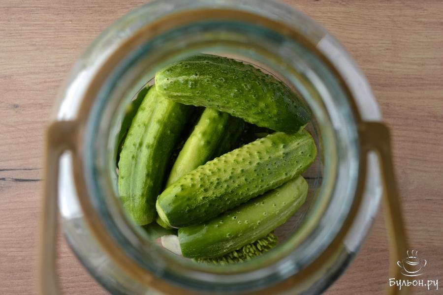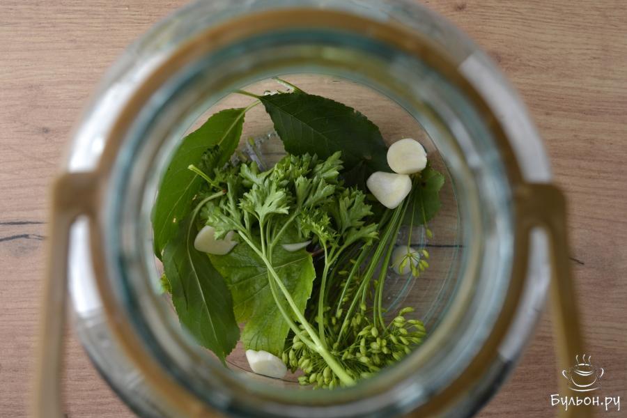 1. Банку и крышку тщательно промойте с содой, ополосните кипящей водой. На дно банки положите нарезанный чеснок, листья черной смородины, вишни, зонтик укропа и петрушку.