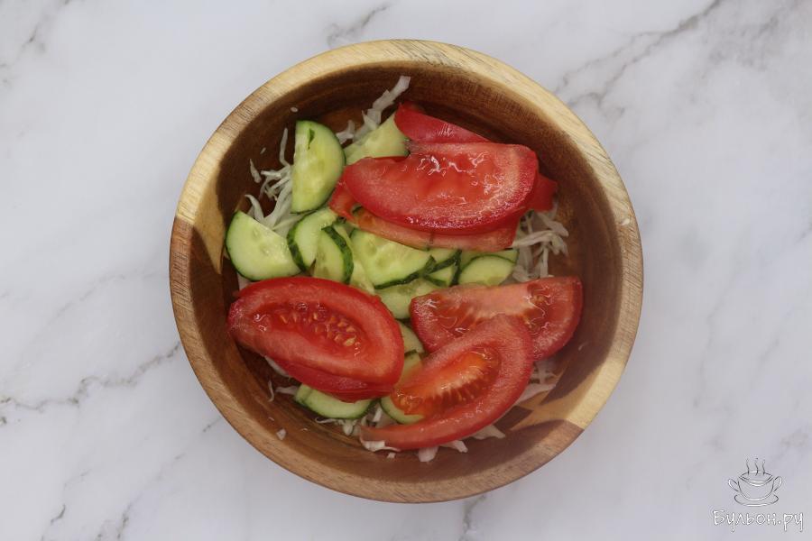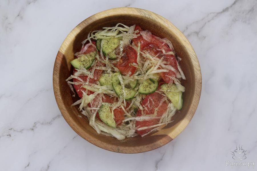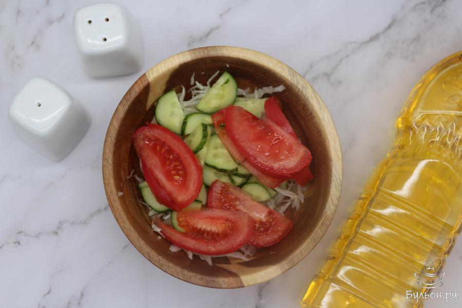 Люблю овощи, поэтому в летний период, когда они особенно вкусные, употребляю их больше, в том числе готовлю различные салаты из свежих овощей. В этот раз представляю вам простой летний салатик, приготовленный из свежей капусты, помидора и огурцов. Салат получается хрустящим, потому что в салате используется капуста и свежий огурец, сочным - за счет помидор, ароматным - так как используется черный молотый перец и нерафинированное масло. Данный салат приготовлен только на одну порцию, поскольку, если его не съесть сразу, то потом помидоры дают сок и салат получается не таким уже вкусным.