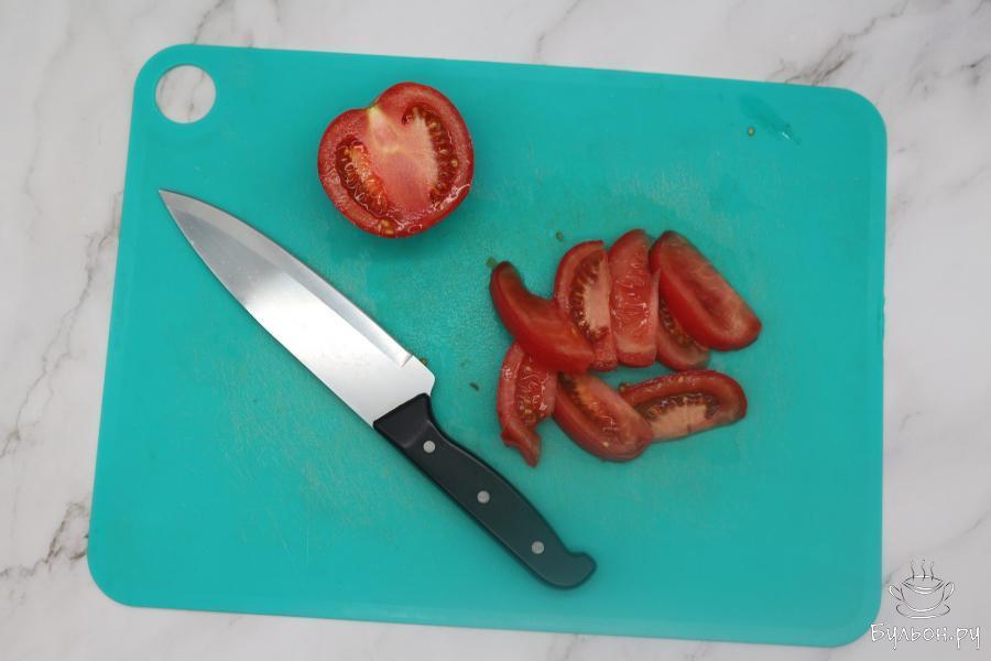4. Помидор возьмите твердый, мясистый. Разрежьте его пополам, вырежьте плодоножку. Теперь нарежьте одну половинку дольками.