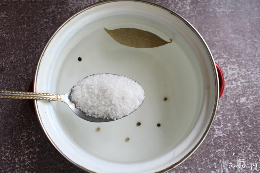 5. В кастрюльку набрать воду, добавить лавровый лист, перец горошек соль и сахар. Довести рассол до кипения.