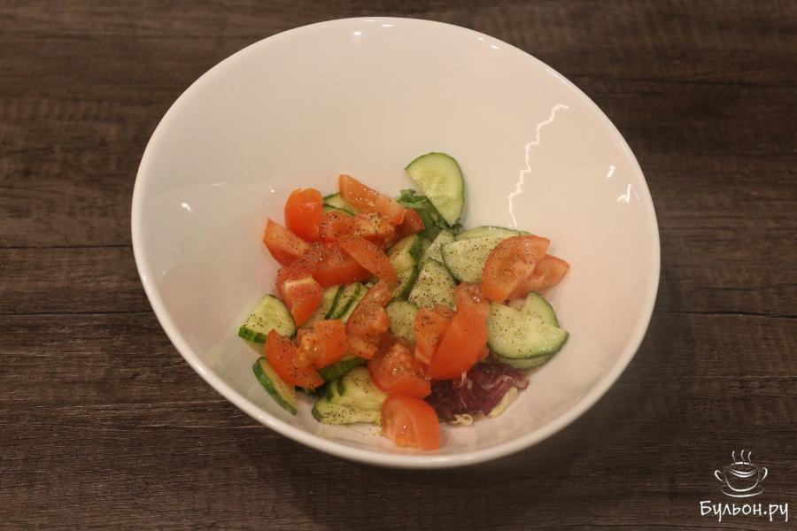 4. Огурец и помидоры нарежьте не крупно, как на фото. Приправьте их солью и черным молотым перцем, добавьте немного масла и перемешайте.