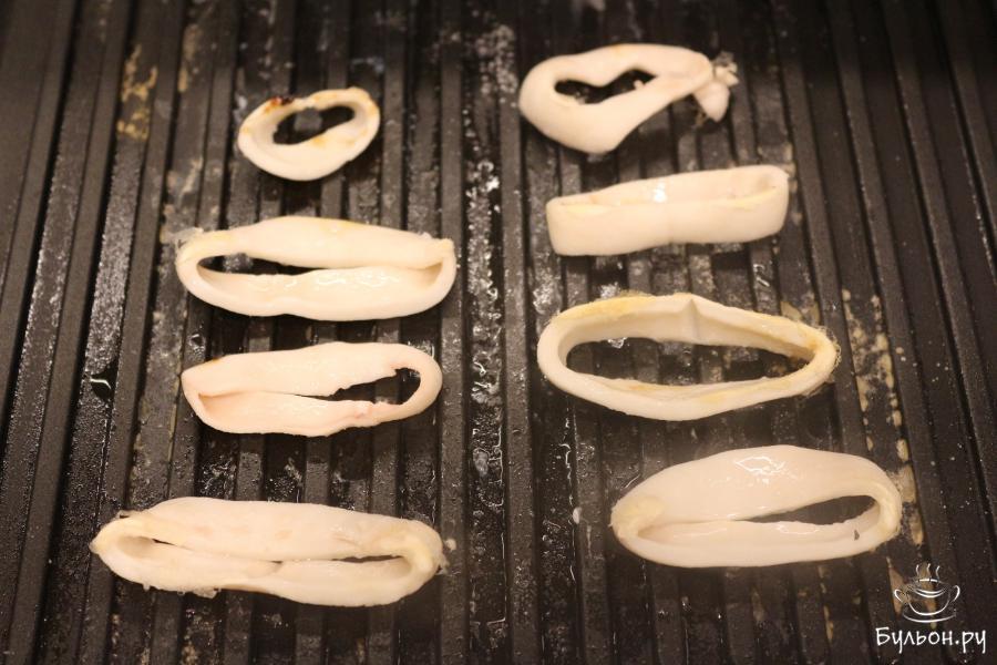 2. Затем гриль смажьте маслом и слегка обжарьте на нем кальмаровые кольца. В конце немного подсолите их.