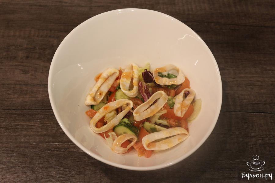 Овощной салат с кальмаром на гриле, с одной стороны обычен, но с другой совсем нет. Да, в этом салате используются обычные овощи. Это салатные листья, огурцы, помидоры. Но, так как их дополняют кальмаровые кольца, обжаренные на гриле и заправленные особенным, остро-сладким соусом чили, который идеально сочетается с морепродуктами, то обычный салат превращается в очень интересное, по сочетанию, блюдо. В салате использованы радиччо, фриссе и айсберг, но это необязательное сочетание. Можно использовать и другие салатные миксы.