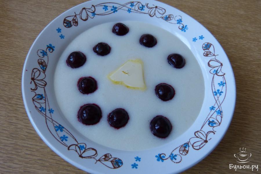 6. И в завершении украсить кашу вишней, как подскажет вам ваша фантазия. Угощайте своих детей и внуков вкусной и красивой на вид кашей из манки на молоке с ягодами вишни.