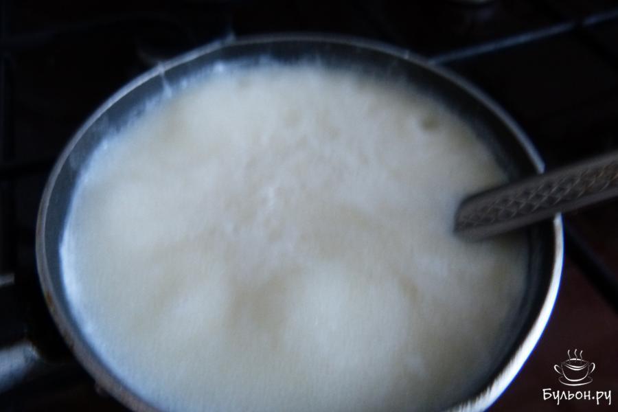 3. Как только закипит, добавить манку. Засыпать надо тонкой струйкой и постоянно мешать, чтобы не образовались комочки.