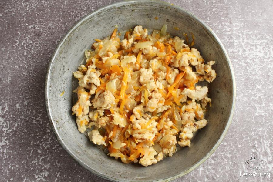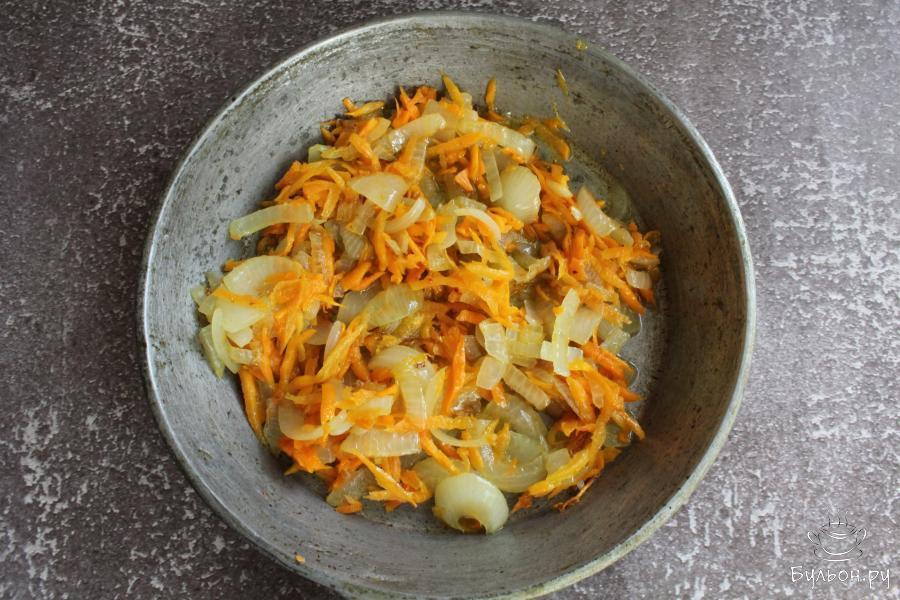 3. Крупную морковь почистить, промыть и перетереть через крупную терку. Добавить морковь к луку и обжарить все вместе 5 минут.