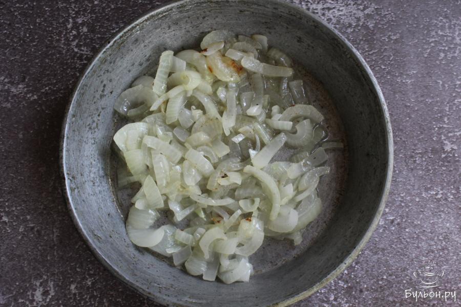 2. Лук почистить, промыть, мелко нарезать и обжарить его до мягкости на сковороде с разогретым маслом.