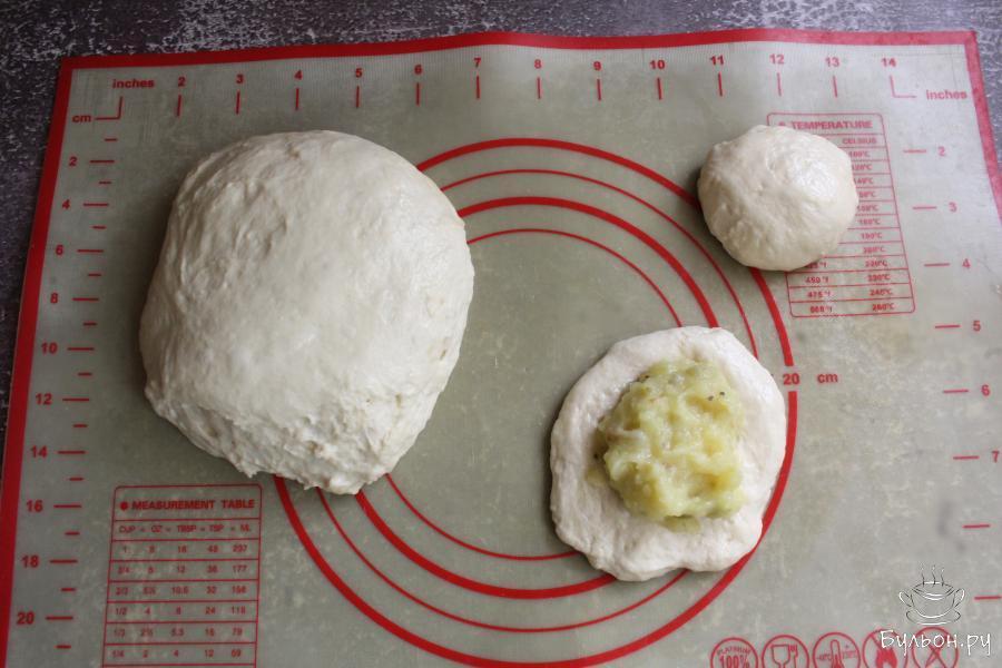 10. Отщипывать от теста одинаковые кусочки, размять кусочки теста в лепешечки толщиной около 0.5 см. Разложить на лепешечки начинку, защипнуть края теста и сформировать пирожки.
