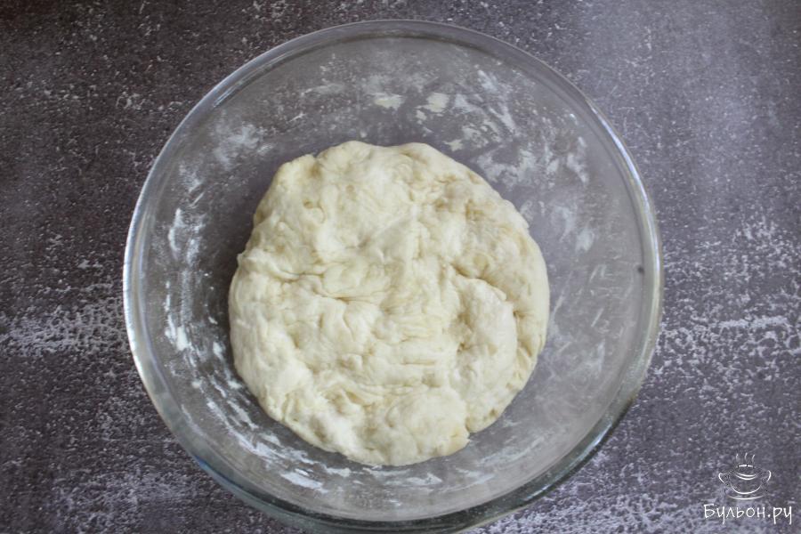 4. Добавить в чашку 2 стакан муки, замесить тесто. Смазать тесто маслом и убрать посуду с тестом на час в теплое место.