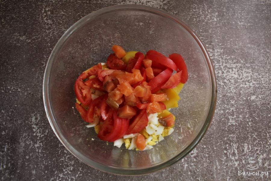 Картофельный салат с копченой семгой и помидорами получается вкусный, полезный, насыщенный и сытный. Порцией такого салата можно заменить обед или ужин. Готовится салат просто и достаточно быстро. Для приготовления можно взять как копченную, так и соленую семгу, все варианты порадуют вас своим вкусом. Салат понравится многим и если у вас есть кусочек семги, то обязательно попробуйте приготовить этот салат.