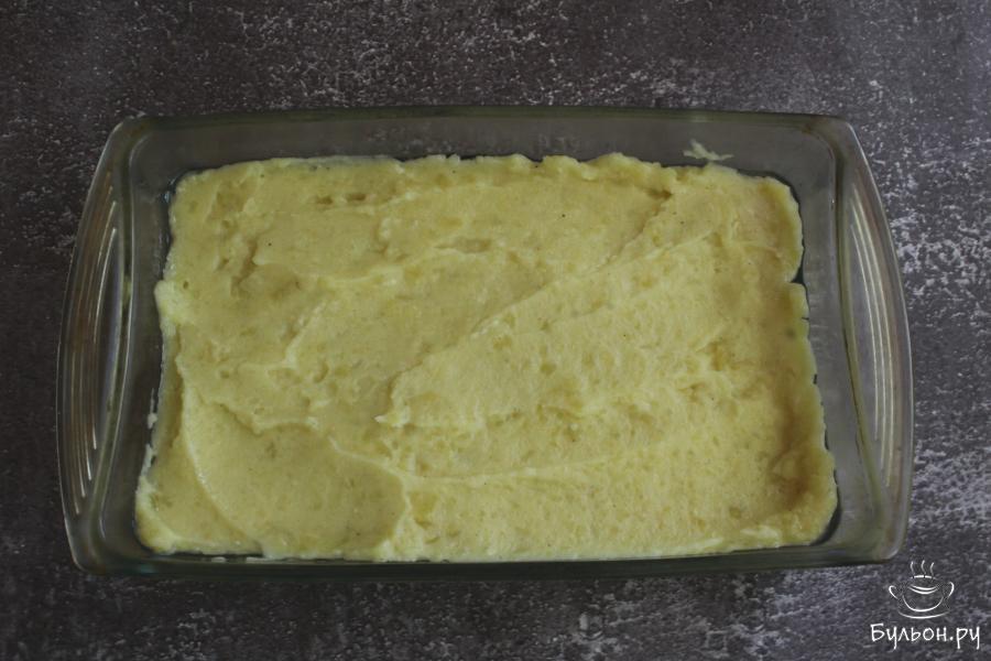 4. Томатную пасту развести водой, немного посолить и перемешать. Смазать картофельный слой томатным соусом.
