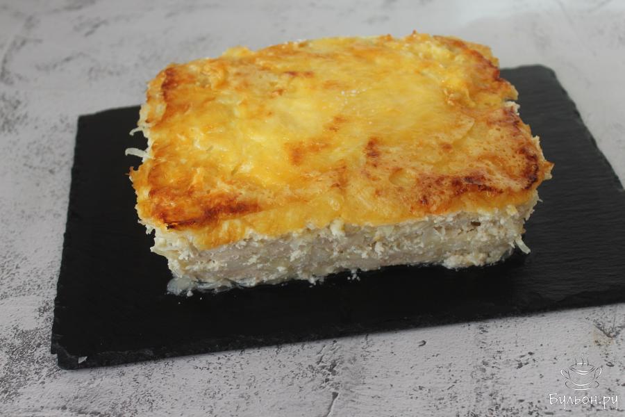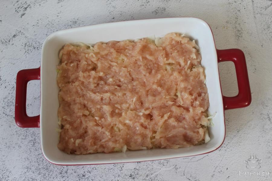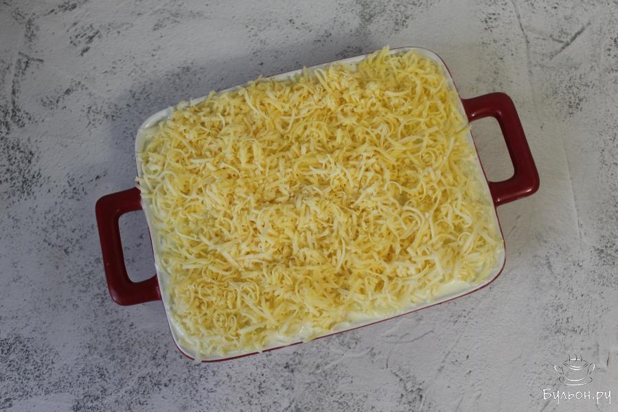 6. Таким образом, повторите эти действия, выкладывая капусту, фарш, заправку, капусту и снова заправку. Сверху выложите натертый сыр и накройте форму фольгой.