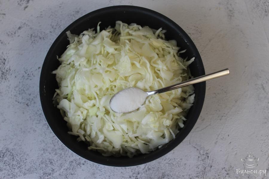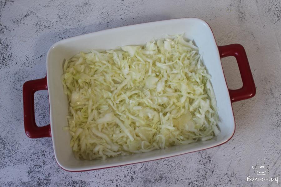 3. 1/3 помятой капусты выложите в смазанную рафинированным маслом форму, разроняйте. Размер прямоугольной формы должен быть примерно 17 см. на 22 см.