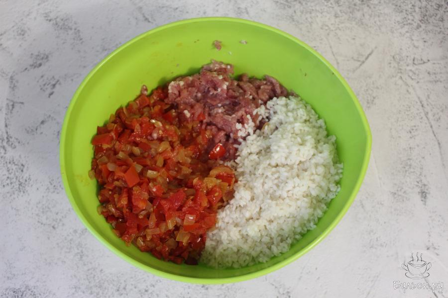 4. Прокрутите мясо, добавьте в фарш запаренный рис и томатно-луковую зажарку, оставив немного зажарки на соус. Посолите и перемешайте.