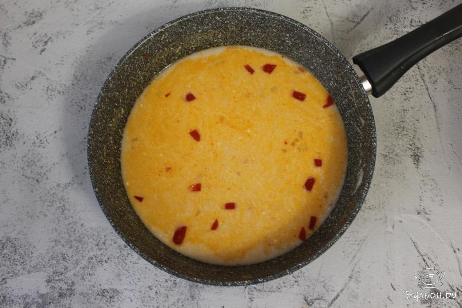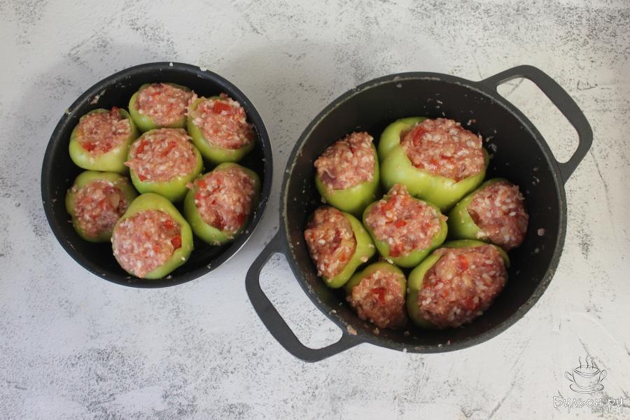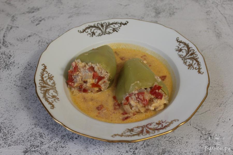 6. В оставшуюся на сковороде зажарку добавьте сметану и влейте кипяток, посолите и тщательно перемешайте. Соус перелейте в казан к перцам и тушите под закрытой крышкой, около часа после закипания.