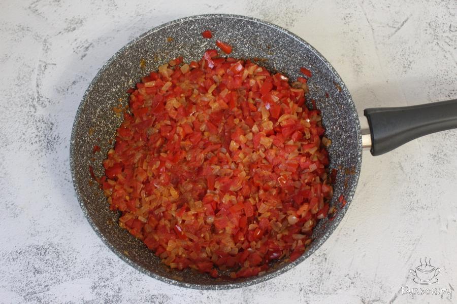 3. Лук нарежьте кубиками и обжарьте до золотистого цвета на растительном масле. Добавьте нарезанные маленькими кубиками помидоры и продолжайте готовить, пока не выпарится вся жидкость.