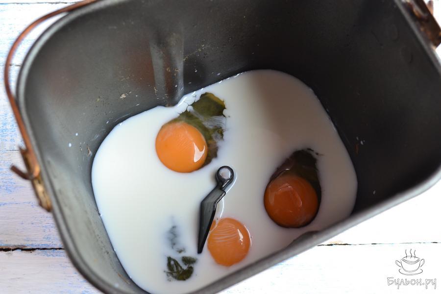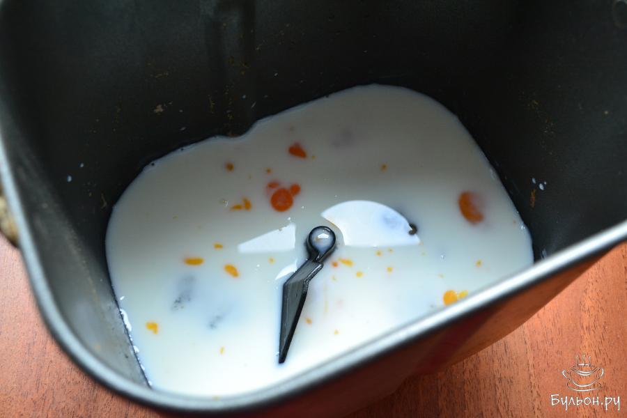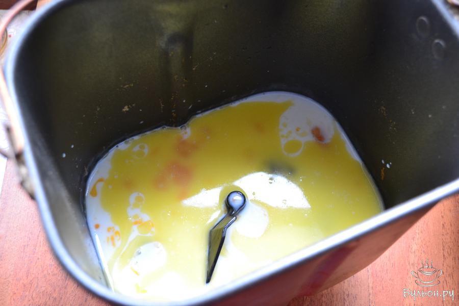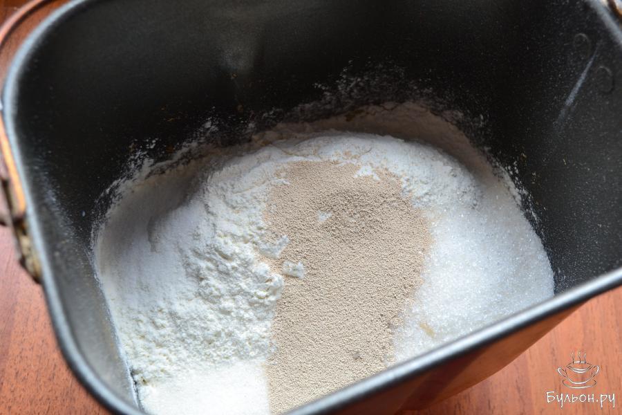 5. Далее всыпать муку, также, добавить соль, сахар, ванильный сахар, в центр всыпать дрожжи. Если у вашей хлебопечки другой порядок закладки продуктов - так и делайте.