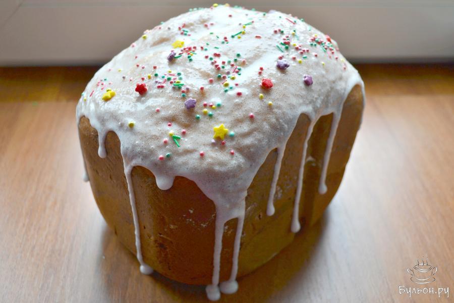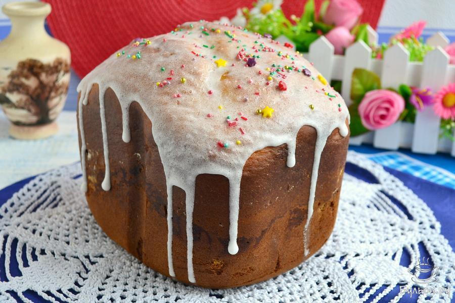 8. Кулич освободить от чаши хлебопечки, дать остыть до теплого состояния, покрыть его любой, на ваш вкус глазурью и посыпать цветной присыпкой.