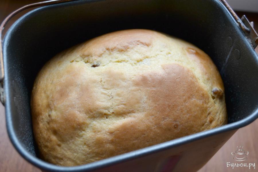 7. Выставить программу Быстрая выпечка, время приготовления 2 ч. 10 мин., средняя или светлая корочка. После определенного сигнала в тесто высыпать изюм. Тесто получится жидковатым, как для бисквита - так и должно быть. Готовый кулич получается пышным и румяным.