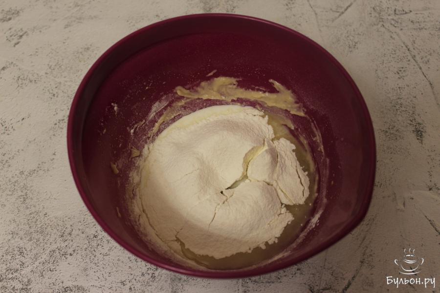 2. Через указанное время влейте кефир, рафинированное масло, всыпьте соль и введите муку. Замесите тесто.