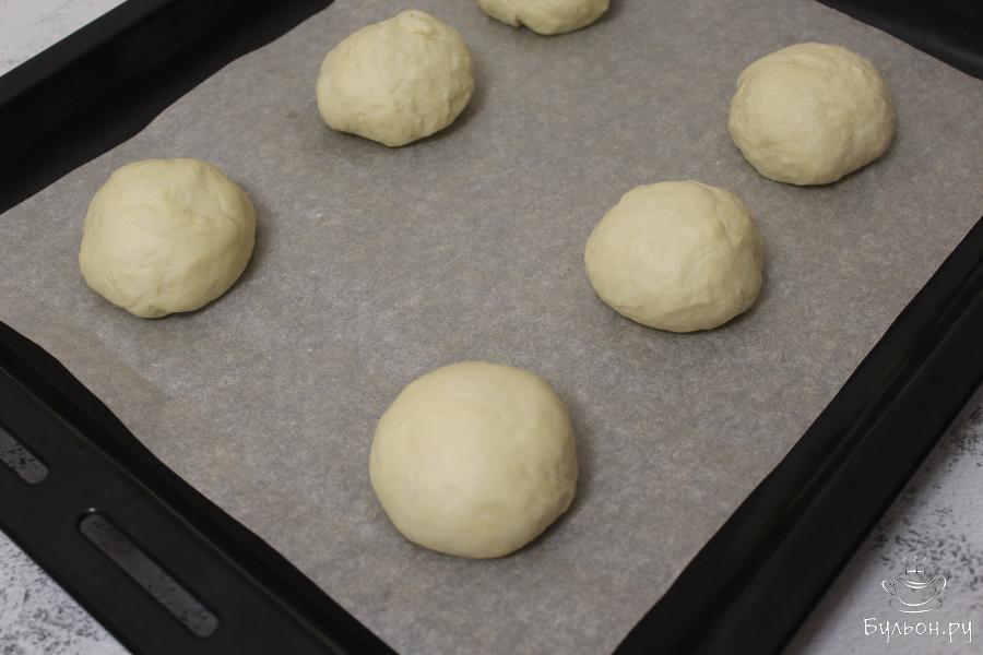 4. Выросшее тесто обомните и разделите на 6 частей. Скатайте каждую часть в шар, слегка смазав руки растительным маслом, и выложите шарики теста на противень, застеленный пекарской бумагой. Снова накройте полотенцем и дайте постоять 15 минут.