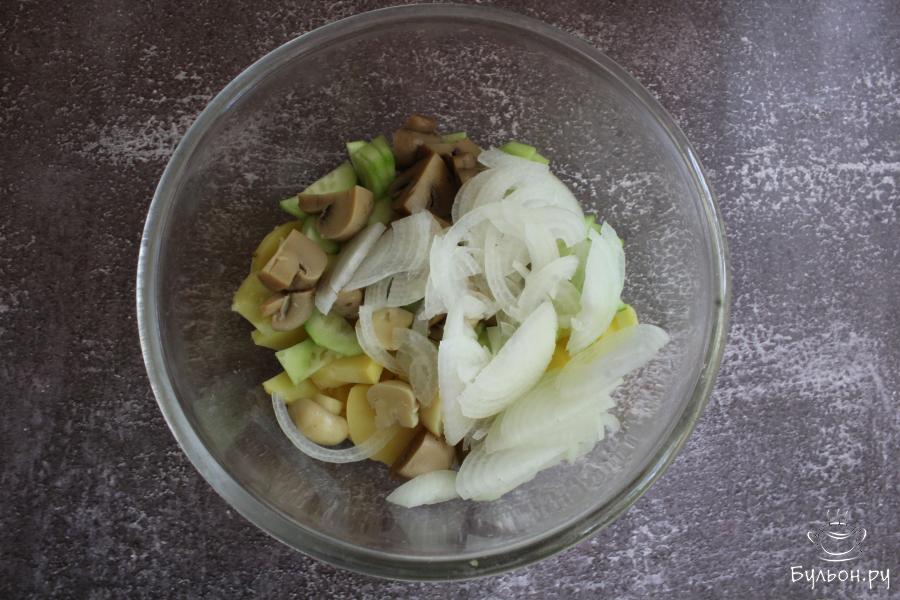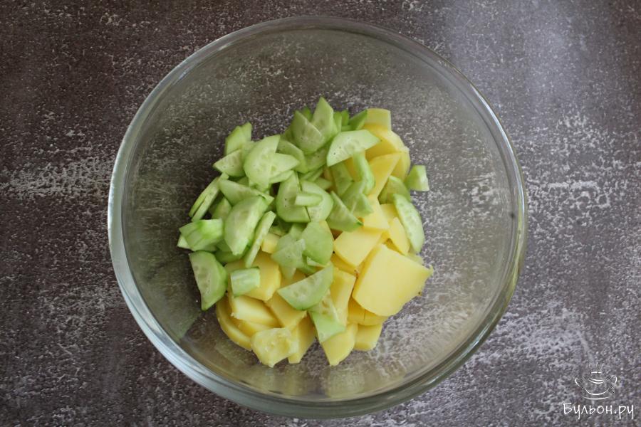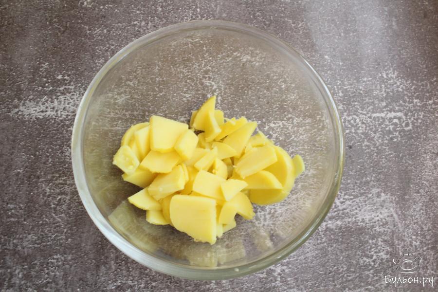 1. Картофель сварить в мундире, остудить и почистить. Нарезать картофель не очень тонкими поукружочками.