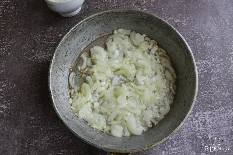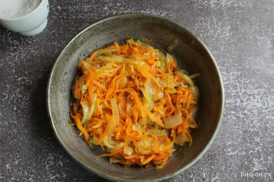 1. Овощи почистить и промыть. Лук мелко нарезать и обжарить на сковороде с разогретым маслом до мягкости.