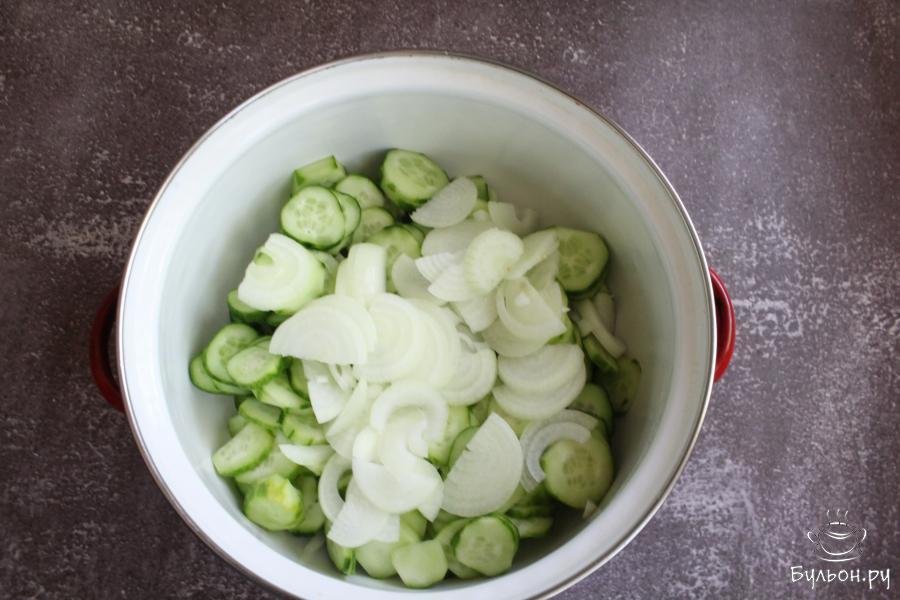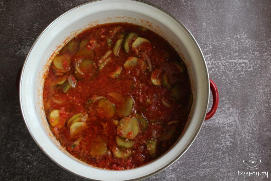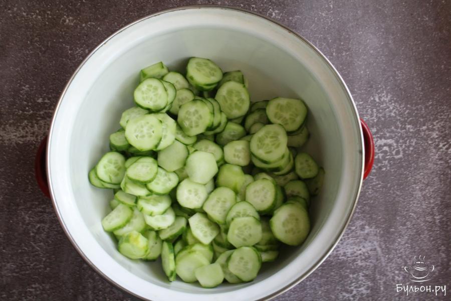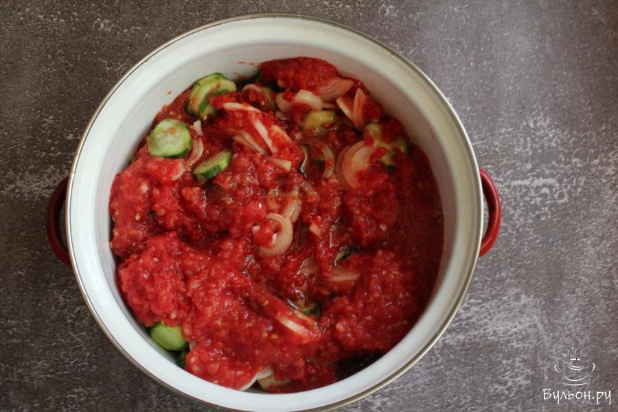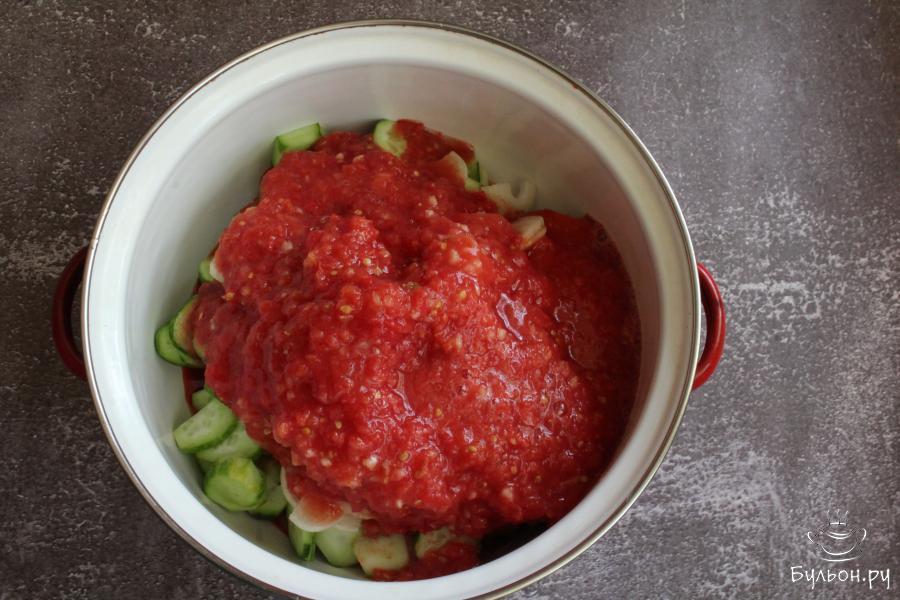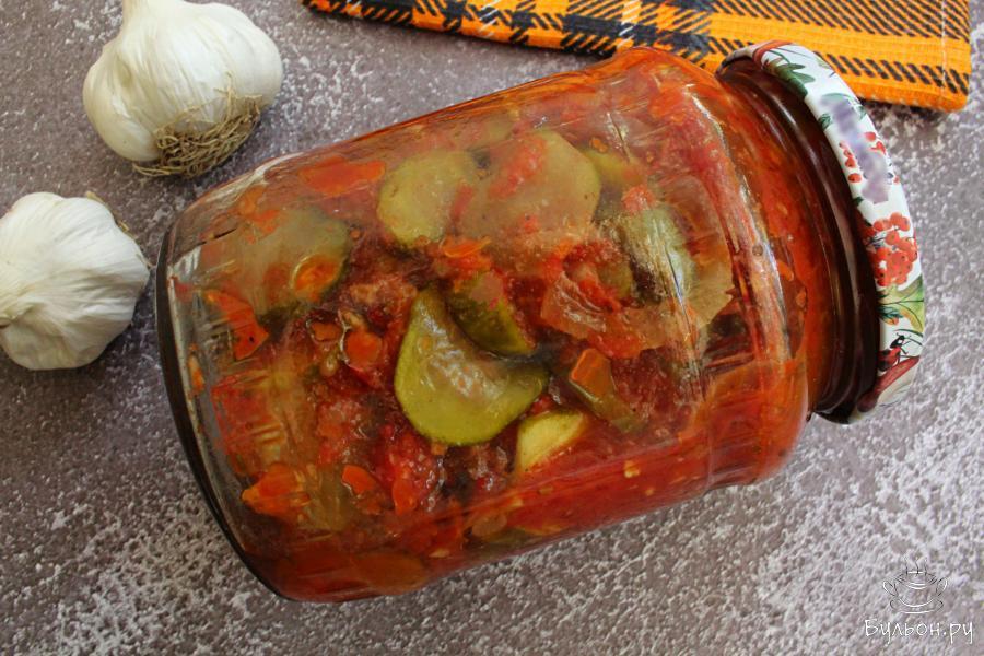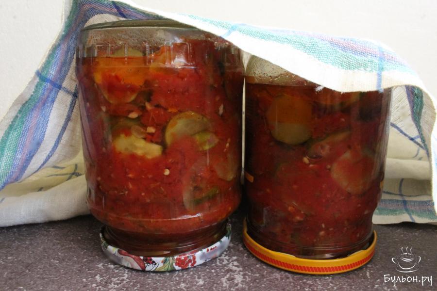 Острый салат из огурцов в томатной заливке на зиму, порадует любителей острых овощных закусок. Салат получается сочный, ароматный, насыщенный и очень вкусный. Готовится салат просто. Зимой этот яркий и легкий салат поднимет вам аппетит. По желанию салат можно сделать не сильно острый. Огурцы можно очистить от кожицы, а можно не очищать, это по вашему желанию. Вкусные овощные заготовки всегда к столу, приготовьте и такой салат тоже!