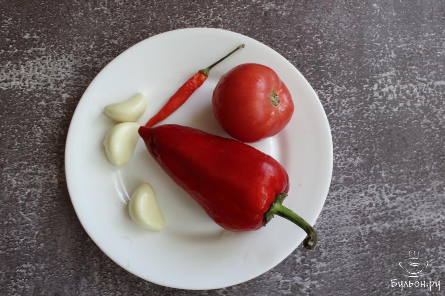 3. Головку чеснока и болгарские перцы почистить. Помидоры, перец чили, болгарские перцы и чеснок промыть. Перекрутить все через мясорубку.