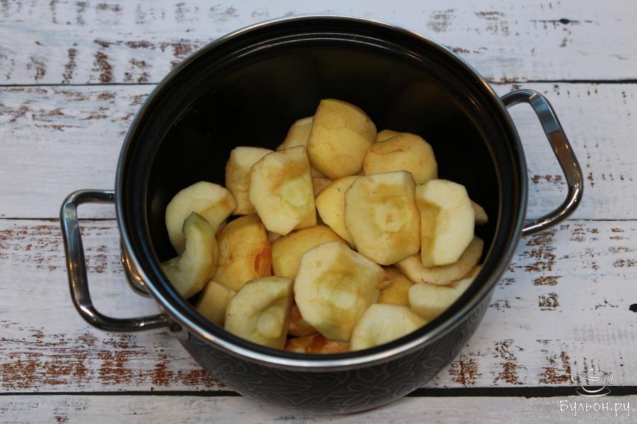2. Нарезанные яблоки положите в кастрюлю. Добавьте очищенную фильтрованную воду, поставьте на плиту и доведите до кипения.