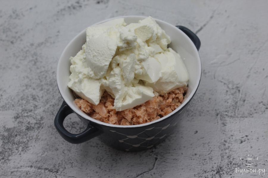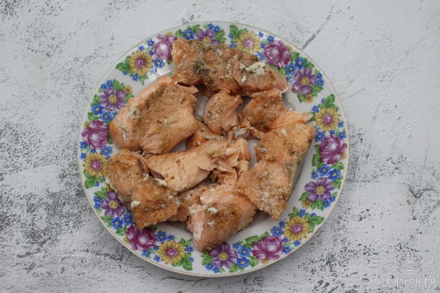 3. С помощью вилки разомните рыбу, переложите размятый лосось в миску, добавив сливочное масло, которое осталось после запекания.