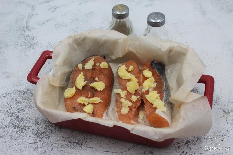 1. Форму для запекания застелите пергаментом. Лосось посолите и поперчите, переложите в латку. Сверху выложите сливочное масло. Поставьте форму с рыбой в, разогретую до 200 градусов, духовку и запекайте 15 минут.
