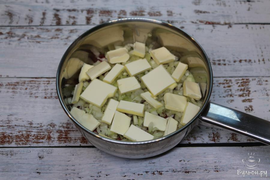 3. Кусок сливочного масла нарежьте на кусочки и положите следующим слоем. Поставьте сотейник на огонь, тушите содержимое сотейника 1 час под крышкой.