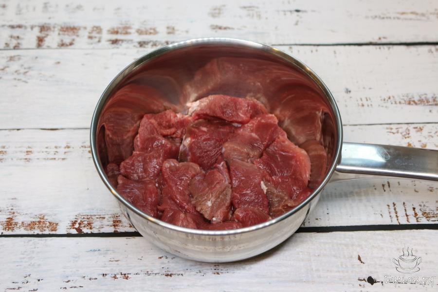 1. Кусок мяса вымойте и нарежьте на куски большого размера. Выложите говядину в сотейник, добавьте немного воды.