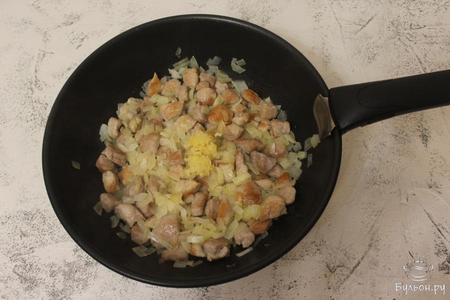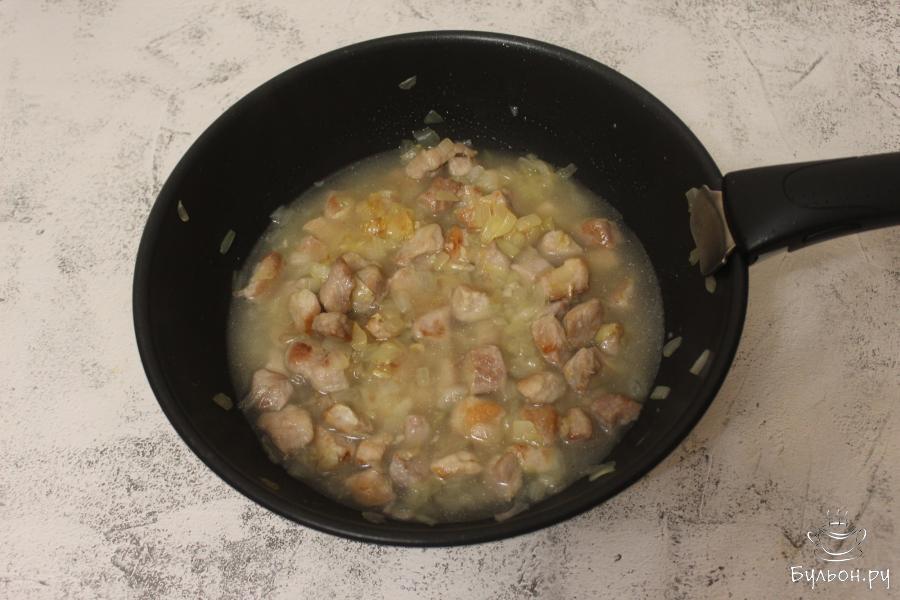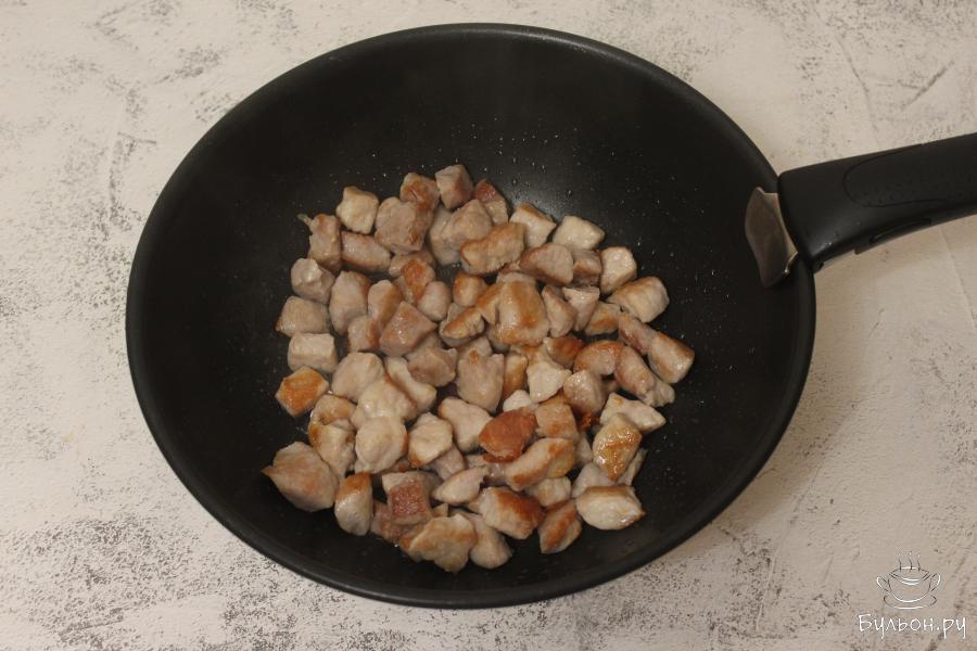 1. Свинину нарежьте средними кубиками и обжарьте на растительном масле, до образования золотистой корочки.