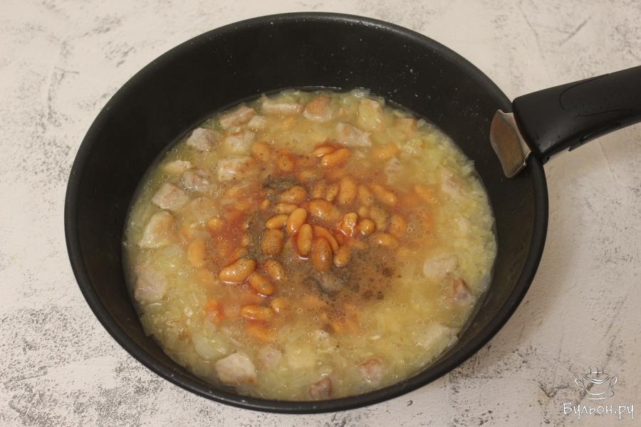 5. Добавьте консервированную фасоль вместе с томатным соком, поперчите, посолите, перемешайте и тушите еще примерно 5 минут.