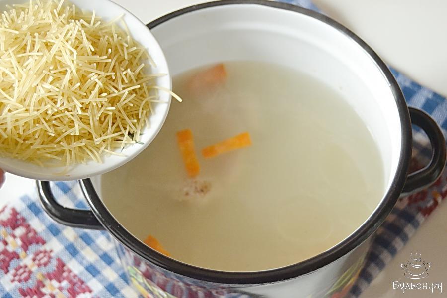 5. Бульон варить до тех пор, пока куриное мясо не станет мягким. Бройлеры варятся быстрее, а не бройлерная домашняя курица может вариться и довольно долго - до двух часов и более. Вермишель добавить тогда, когда мясо будет готово.