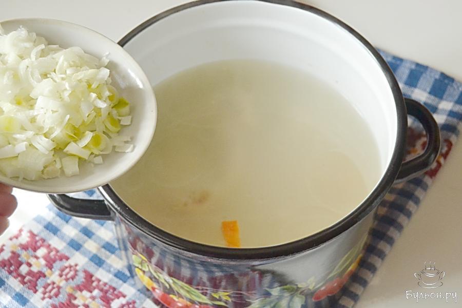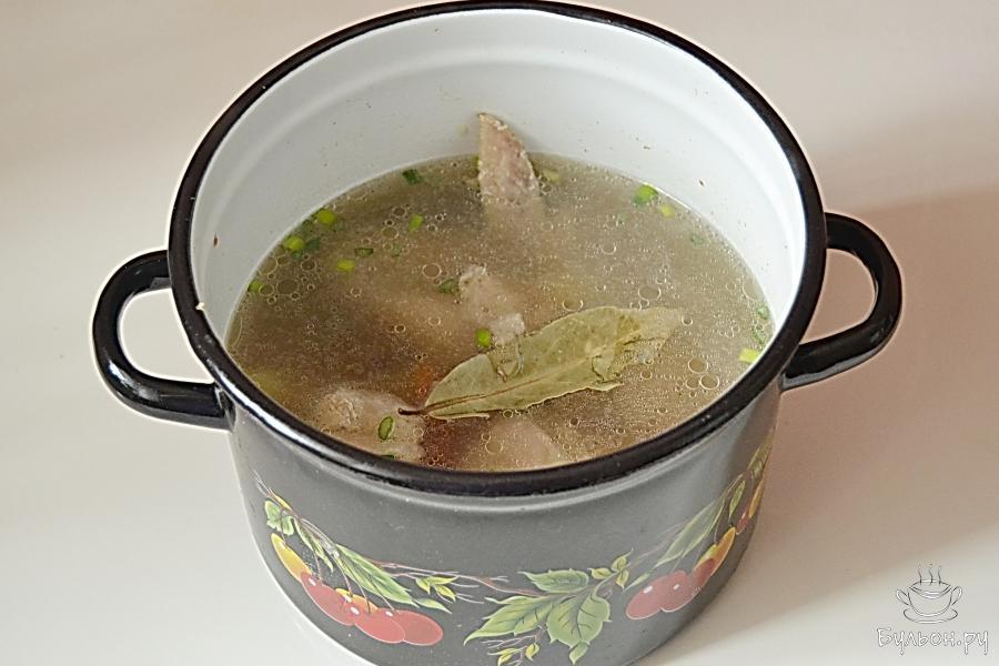 6. Поварить еще минут 10 бульон вместе с вермишелью. В конце варки добавить лавровый листок и черный перец. При подаче добавить свежий зеленый лук.